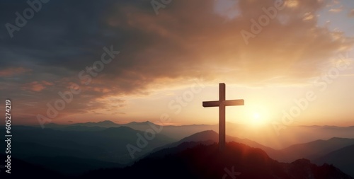 The crucifix symbol of Jesus on the mountain sunset sky background, Generative AI