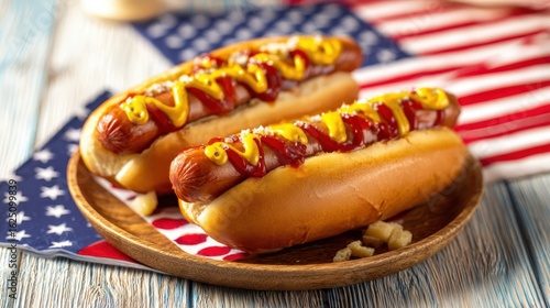 food, hot dog, summer, picnic, bar-b-q, ketchup, mustard, american, snack, comfort, cookery, party, plate, flag, red, yellow, grilled, meal, delicious, tasty, epicure, brunch, lunch, fast food, herb, fresh, appetising, casual attire, table, cookout, traditional, festive, celebration, grilling, condiment, savoury, indulgent, platter, heritage, panoramic