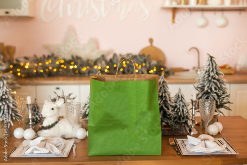 The delivery service packages are on the kitchen table decorated for Christmas. Gifts and ready meals are delivered and prepared for the new year.