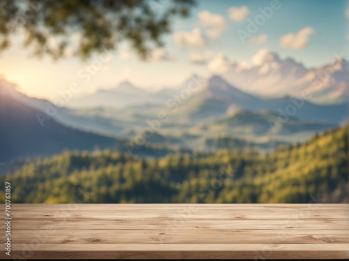 The empty wooden table with blurred background of a mountain lush image to mount your product digitally.