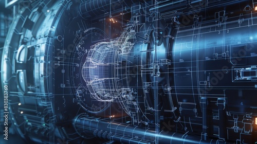 The exterior and interior of a reactor vessel, showcasing its robust design and high-pressure environment, in a detailed engineering blueprint style
