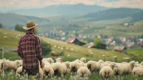 farmer, agriculture, nature, outdoors, farming, sheep, shepherd, farm, landscape, green, field, working, rural, countryside, pasture, summer, animal, grass, hat, grazing, mountain, cow, plaid, traditional, farm animal, peaceful, rustic, lifestyle, flock, scenic, farmland, village, home, idylli, hill, barn, vista, agrarian