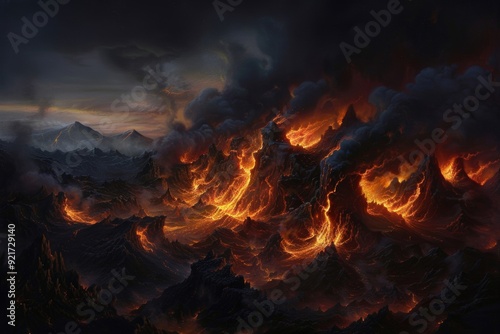 The flickering warmth of hellfire illuminates an infernal landscape, creating a menacing and intense atmosphere.