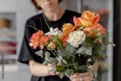 rose, flower, floristry, florist, spring, colours, orange, holiday, gift, bouquet, wedding, bride, flower, rose, love, bridal, dress, marriage, groom, pink, celebration, ring, ceremony, woman, hand, beauty, married, holding, decoration, hand, romance, couple