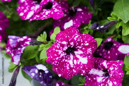 The flowers of pink vivid Petunia close up. Bright flowers of petunias in the garden