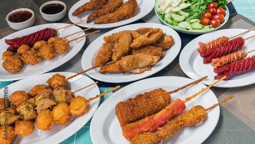 The fried meatballs made from a variety of meats and sausages, mixed with flour and seasonings with a delicious spicy sauce and come with cucumber, cabbage, tomato and lettuce as sides. Street Food.