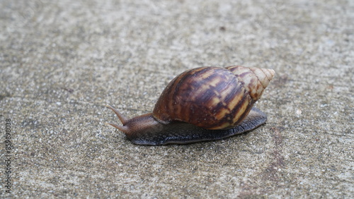The Giant African Snail (Achatina fulica) is one of the largest land snails in the world, known for its impressive size and distinctive coiled shell.