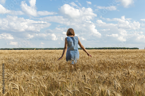 The girl is on the yellow wheat field. White clouds and blue sky in the background.