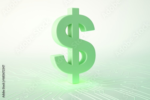 The Green Dollar: A vivid 3D rendering showcases a luminous green dollar sign, radiating financial success, set against a backdrop of a cutting-edge circuit board.