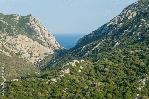The green valley in spring and the sea view behind it. Green forest land and seascape in the background. Wonderful valleys and bays overlooking the sea. Muğla, Türkiye.