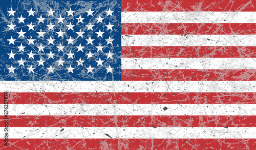 The grunge flag of the United States of America is colored. The effect is scratched, worn, old. Vector art design, template.