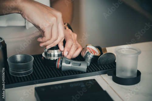 The hand of a female barista is producing quality coffee.