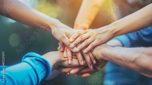 The hands of diverse individuals join together in a unified stack, symbolizing teamwork, solidarity, and collective strength, with soft sunlight creating a warm, hopeful ambiance.