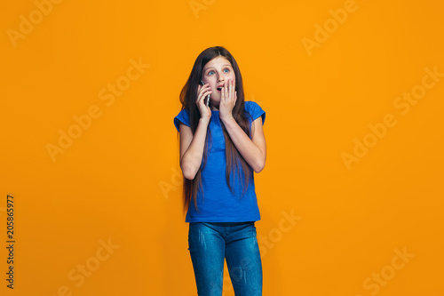 The happy teen girl standing and smiling against orange background.