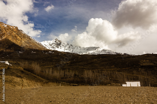 The Himalayan landscape with cloudy skies and snow covered mountains around the quiet, high altitude village of Muktinath on the Annapurna Circuit trekking trail in Mustang in Nepal.