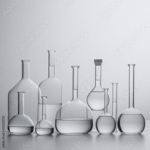 The image depicts a laboratory scene with chemistry glassware such as beakers, test tubes, and bottles The setting features scientific equipment, a water bottle, and items used in medical research and