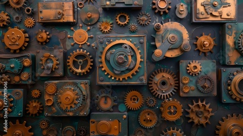 The image is a collage of various gears and clockwork parts, creating a sense of nostalgia and a feeling of being transported back in time. The use of different sizes