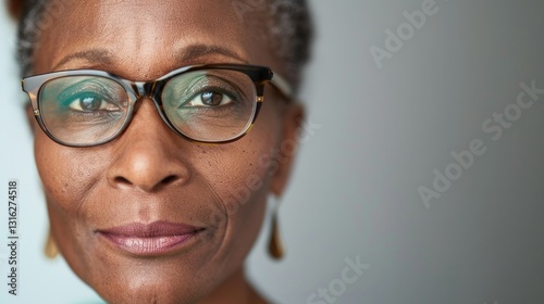studio, horizontal, closeup, portrait, woman, eyeglass, beauty, goggles, optical, eyewear, vision, opthalmology, optometry, sight, health care, medicals, style, fashion, accessory, modern, focused, doctor, professional, health care, female, afro, african american, black, african, senior, retired
