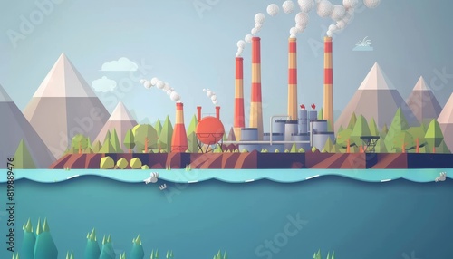 The image shows a factory on the coast. There are mountains in the background and the factory is emitting smoke into the air and water.