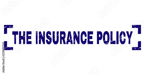 THE INSURANCE POLICY text seal stamp with corroded effect. Text title is placed between corners. Blue vector rubber print of THE INSURANCE POLICY with corroded texture.