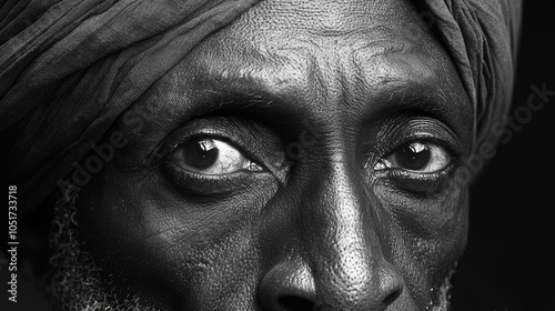 The Intensity of the Gaze: Hyperrealistic Close-up Portrait of a Tuareg .Concept of traditional culture, nomadic lifestyle, desert aesthetics, portraiture, black and white photography.