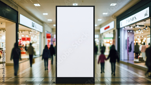 the interior of the shopping center. In the center is a large vertical billboard with an empty white screen.