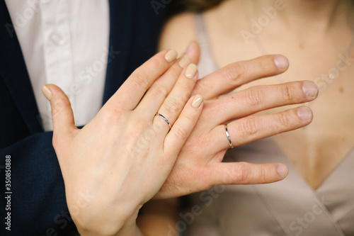 The joined hands of the bride and groom at a wedding. Wedding rings on the fingers of the newlyweds. Hands close up.