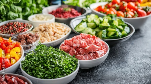 The ketogenic diet promotes a low-carb lifestyle. Fresh ingredients arranged in bowls for meal preparation.