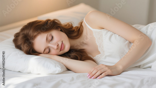 sleep, woman, white, bed, pillow, quilt, hair, lace, quiet, comfortable, relax, cosy, sweet, dream, rest, warm, atmosphere, bedchamber, sunlight, posture, soft, tranquil, beautiful, time, moment, safe, healthy, joyful, happy