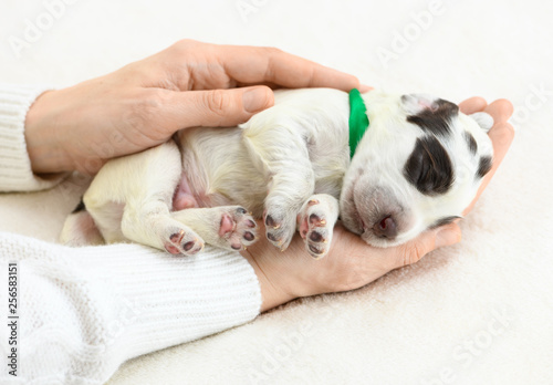 little, white, puppy, sleep, female, hand, indoor, dog, pet, domestic, animal, palm, care, spaniel, breed, newborn, puppy, small, 1, girl, human, woman, baby animal, owner, dream, rest, tenderness, gentleness, softness, caress, pedigree, purebred, comfortable, cosiness, calmness, calm, plaid, soft, blanket, inside, adorable, pretty, cute, nice, doggy, colours, russian, closed eyes