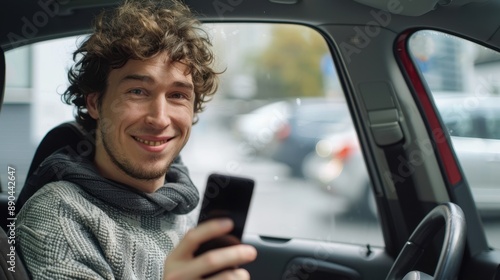 man, technology, portrait, happy, joy, phone, smile, city, outdoors, car, young, modern, smartphone, casual attire, vacation, urban, driver, vehicle, hoodie, male, fun, selfie, relaxed, beard, curly, communication, sitting, mobile, transportation, interior, road, holding, journey, lifestyle, laugh, passenger, traffic, trip, casual clothes, steering wheel, windscreen, parking