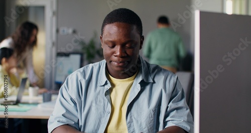 The man is using a computer, he is smiling. He is sitting at his desk in the office next to his colleagues.