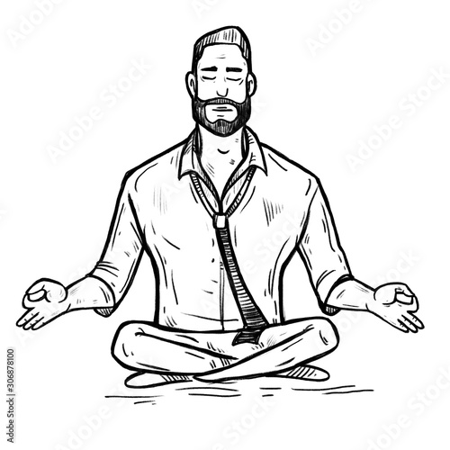 illustration, cartoon, retro, white, drawing, man, meditation, yoga, relax, business, pose, vignetting, modern, hipster, intelligent, success, line, harmony, gymnastics, creative, power, energy, symbol, art, reiki, sport, office, shirt, attaching, beauty, beard, healing