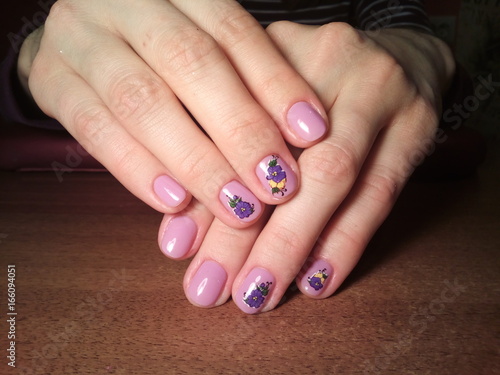 The manicurist excellently made her work a beautiful manicure with a polish gel on her hands and the client is happy
