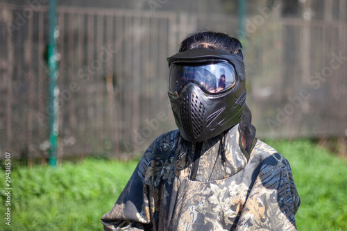 The masked man. Sports mask for playing paintball on the player’s head. Black mask with safety glass. Protection for the whole face from bullets with paint.