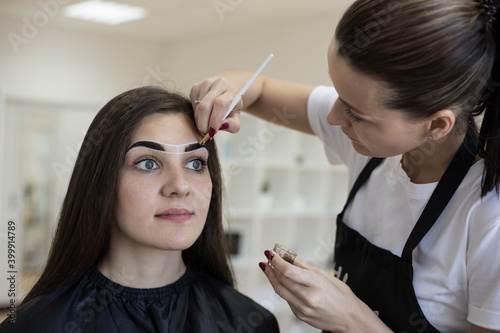 The master in the beauty salon applies a shade of eyebrows with a makeup brush. Coloring eyebrows with henna. Microblading. Eyebrow correction.