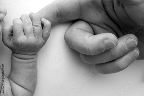 The newborn baby has a firm grip on the parent's finger after birth. Close-up little hand of child and palm of mother and father. Parenting, childcare and healthcare concept. Black and white photo.