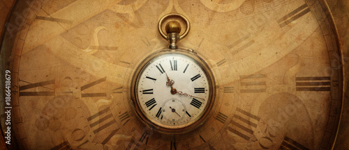 The old antique classic clocks on a vintage wide paper background. Concept of time, history, science, memory, information. Retro style. Vintage clockwork aand watch background.