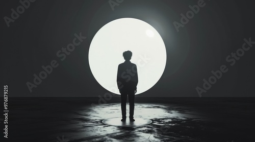 The person is placed against a contrasting black background with a large white circle behind them, creating a stark contrast
