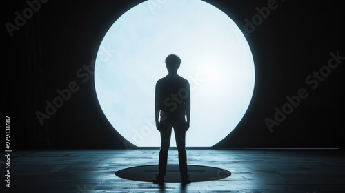 The person is placed against a contrasting black background with a large white circle behind them, creating a stark contrast