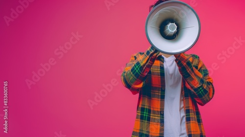 megaphone, modern, advertising, fashion, person, studio, human, announcement, plaid, shout, young, casual attire, colourful, communication, expression, shirt, loudspeaker, holding, pink, fun, style, background, speech, male, trendy, vibrant, adult, isolated, sharpened, standing, speaking, casual clothes, talk, voice, alone, front, stripes, graphic, attire, outerwear, front view