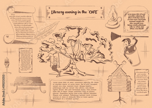 literary, evening, cafes, lamp, placemat, poster, invitation, light, bench, tree branch, flower, street, blooming, scroll, feather, kerosene, plaque, frame, title, meeting, oak, history, motif, novel, poem, epic, legend, fiction, reading, book, cat, chain, russian, mermaid, hut, chicken, leg, ink