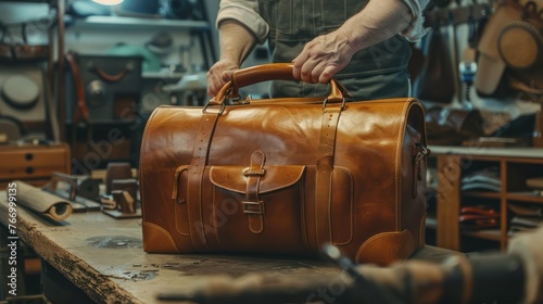 leather, travel bag, craft, workshop, hand-made, stitching, sewing machine, template, pattern, design, workbench, tool, hide, material, tannery, cutting, craftsman, artisan, professional, tradition, quality, luxury, hard-wearing, strong, vintage, classic, timeless, meticulous, precise, concentration, focused, skill, life events, technique, passion, dedication, heritage, history, functionality, compartment, closure, zip, buckle, handle, strap, travel