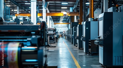 The production floor of a big digital printing company with large print machines printing packaging designs