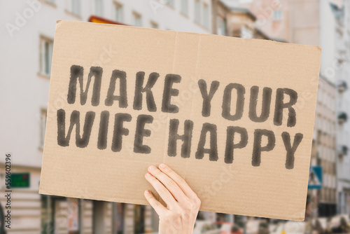 The question " Make your wife happy " is on a banner in men's hands with blurred background. Married. Smile. Bride. Smiling. Family. Young. Girlfriend. Gold. Lady. Romantic. Boyfriend