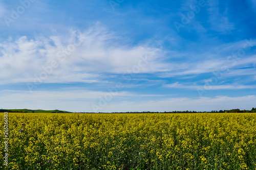 The rapeseed field is a plant. Oil colors in a rapeseed field with blue sky and clouds. Yellow field in bloom