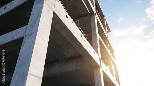The raw skeleton of a building under construction reaches towards the sky, its concrete beams catching the sunlight, a testament to modern architecture and structural engineering.
