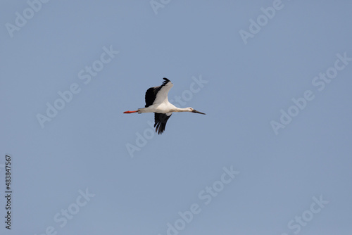 The Red Book Far Eastern stork flies spreading its wings against the background of the blue sky.