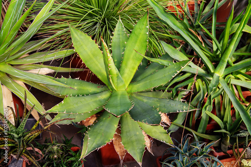The Scarlet brevifolia plant (lat. Aloe brevifolia) with prickly green leaves on a clear sunny day. Flora plants flowers floristry.