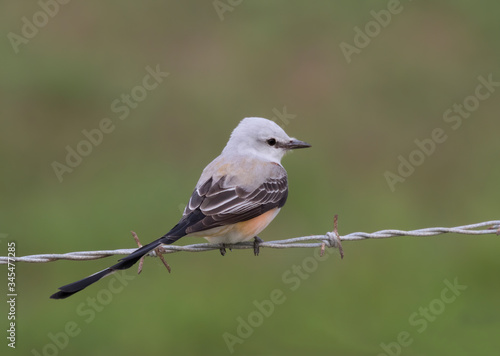 The scissor tailed flycatcher (Tyrannus forficatus) on a greenbackground, Texas